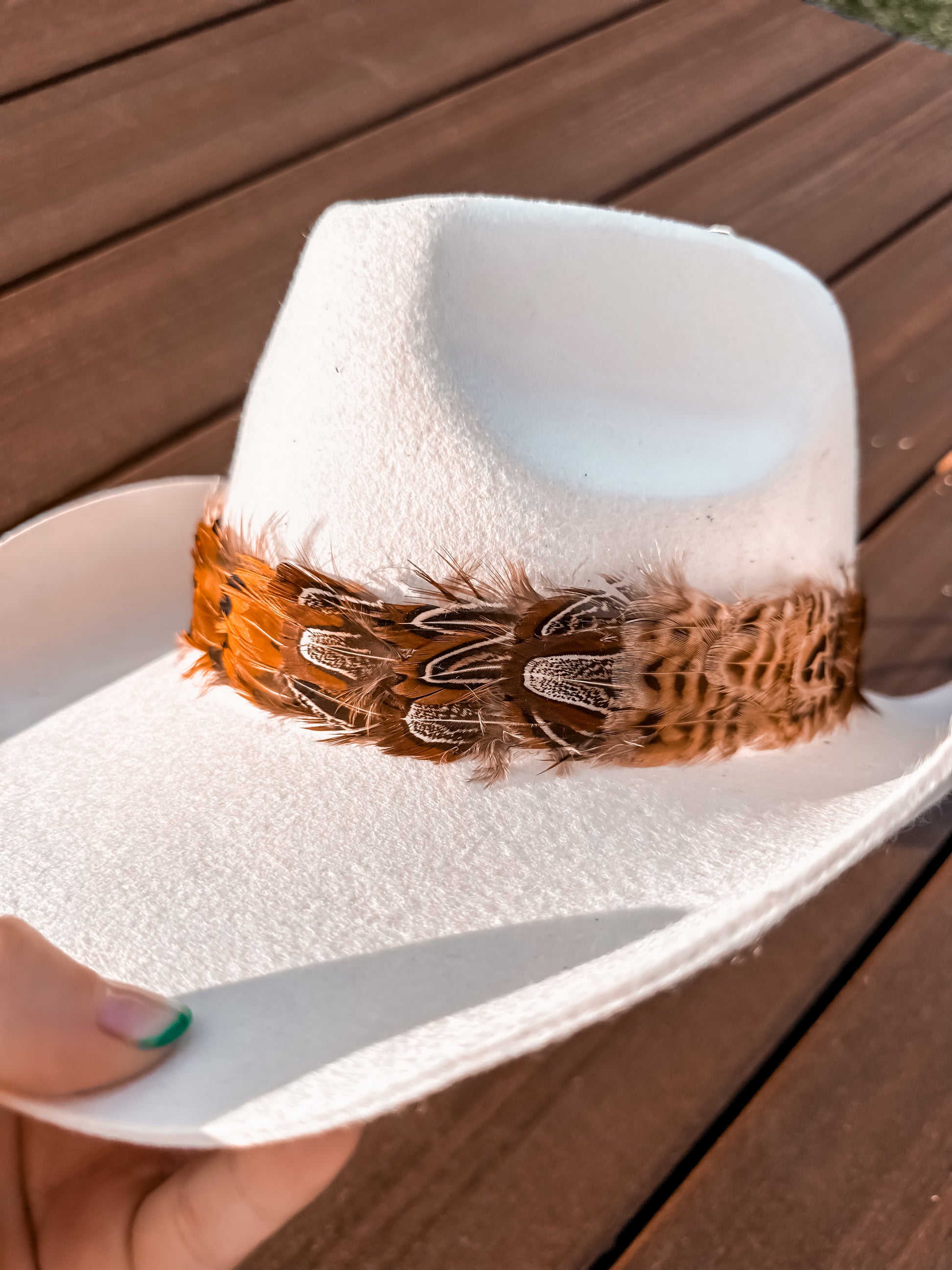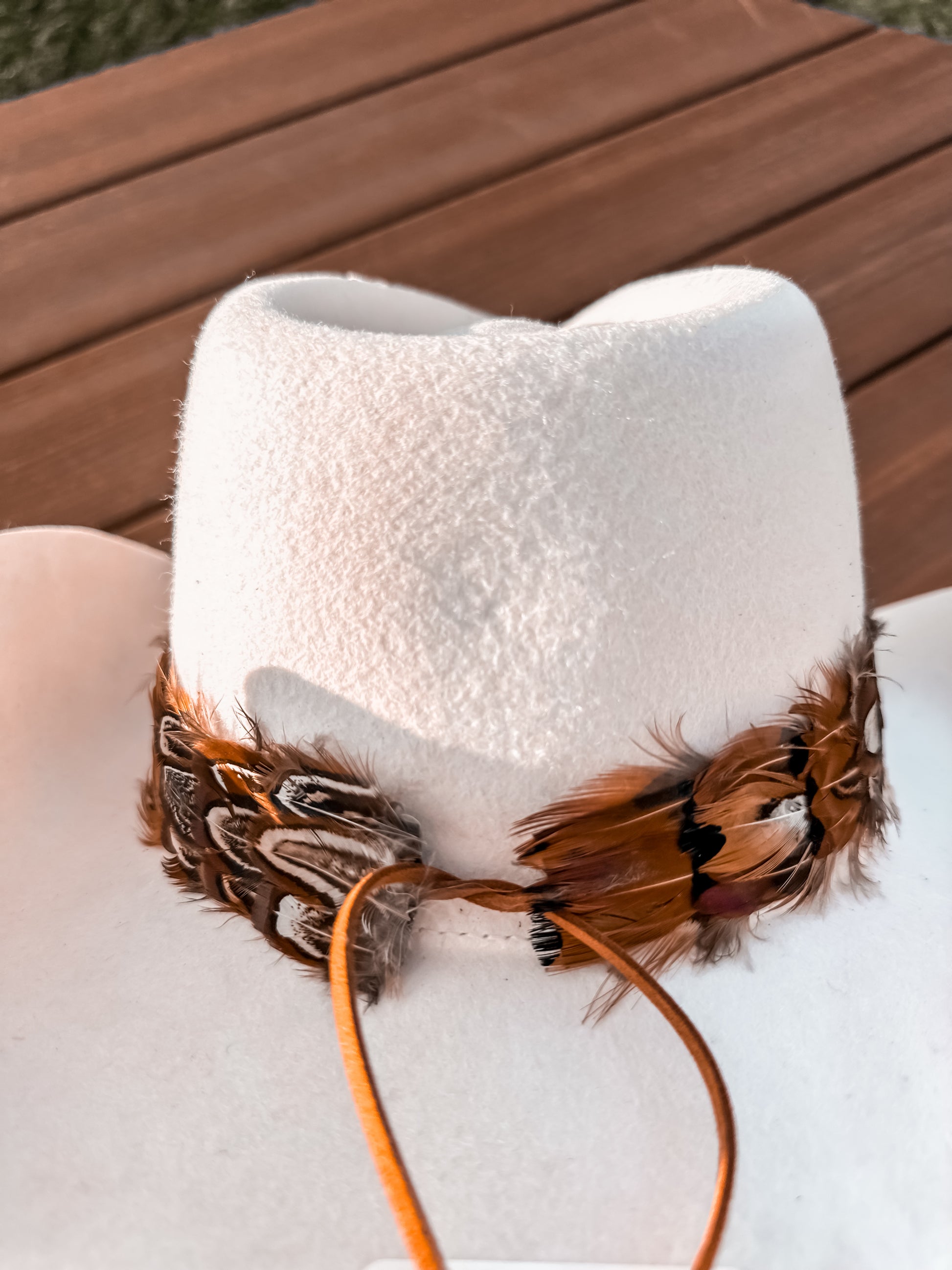 Feather hat band. Strip of feathers you can wrap around your hats. length 23" thiner band width 1/2" regular width 1" These bands have a ribbon back holding the feather together and a ribbon thin strap on each end of each side to tie a knot. Allowing you room for larger hats. (new suede tie ) Hat Band Only, Hat NOT Included