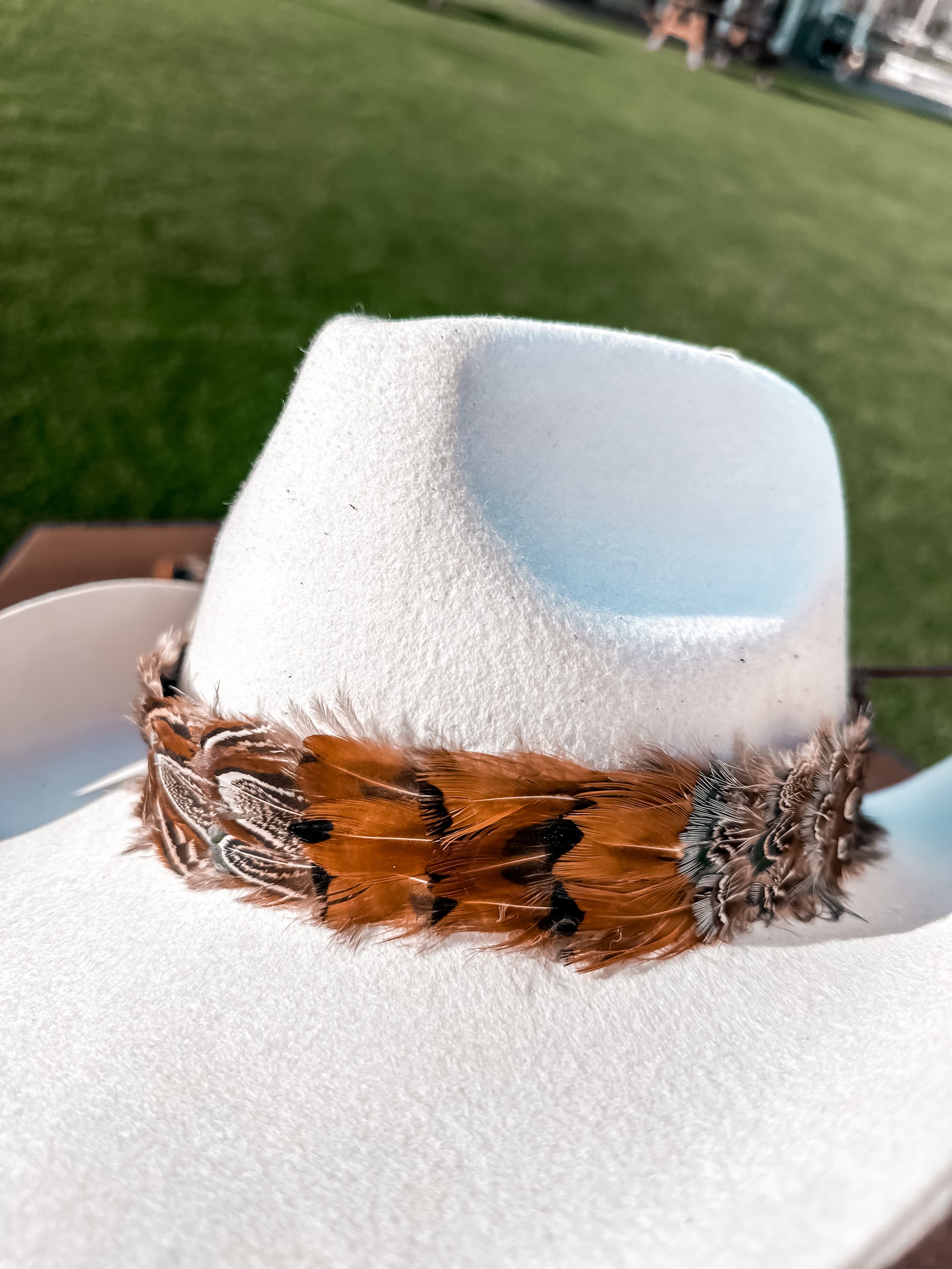 Feather hat band. Strip of feathers you can wrap around your hats. length 23" thiner band width 1/2" regular width 1" These bands have a ribbon back holding the feather together and a ribbon thin strap on each end of each side to tie a knot. Allowing you room for larger hats. (new suede tie ) Hat Band Only, Hat NOT Included